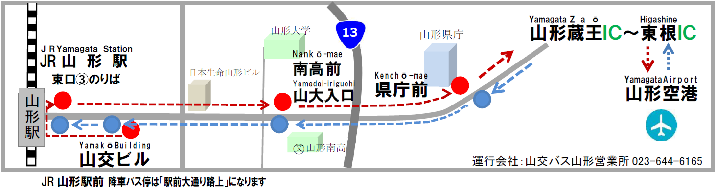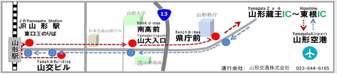 | Yamakō-buildingBus Terminal #4 | JR Yamagata StationEast Exit #3 | Nankō-mae / Yamagata Univ. Entrance | Kenchō-mae | Yamagata Airport | ScheduleDeparts/Destination/Flight | |||